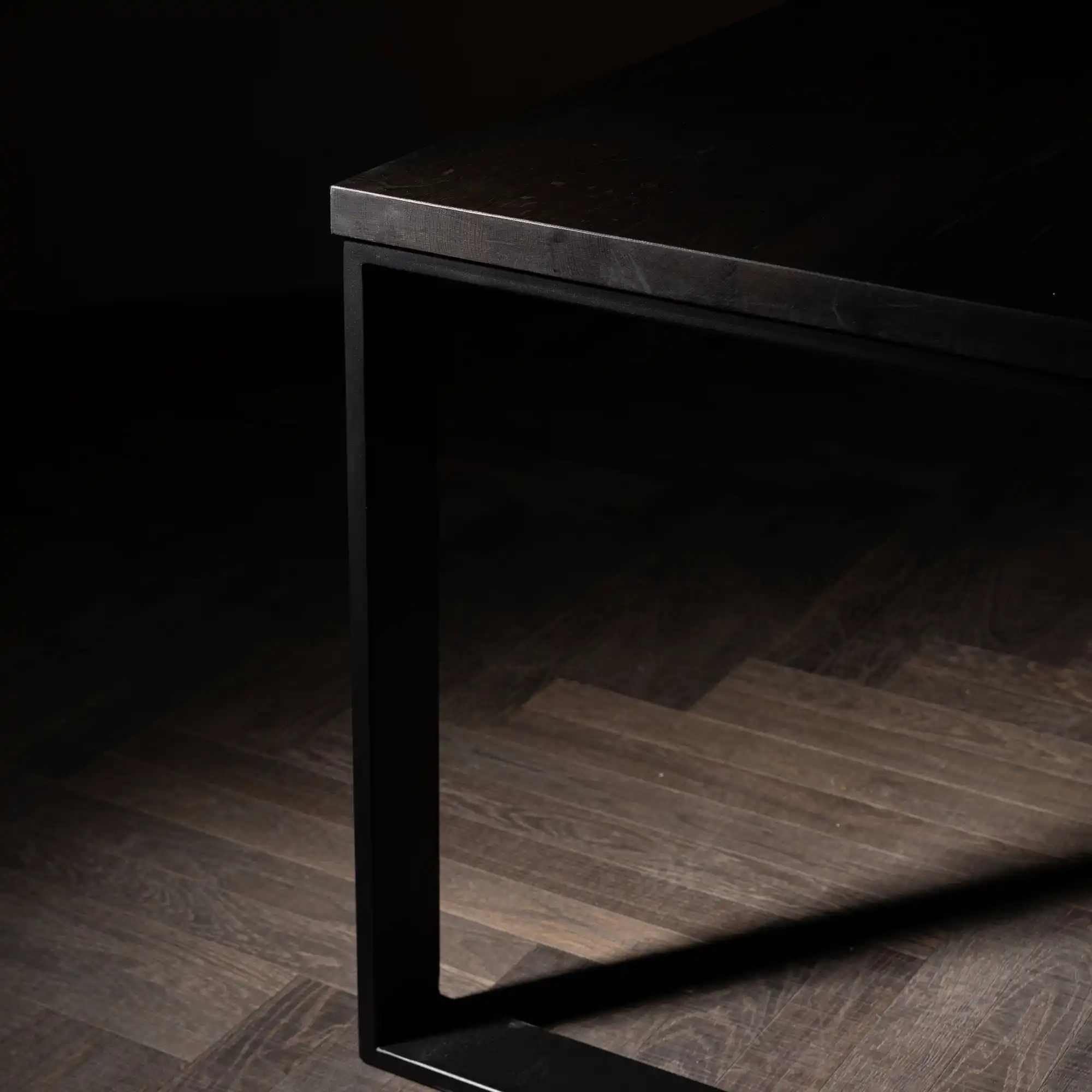 Kufen aus eckigem Stahlrohr setzen die klare Linie der Platte zum Boden fort und verleihen dem massiven Holz eine minimalistische Leichtigkeit.