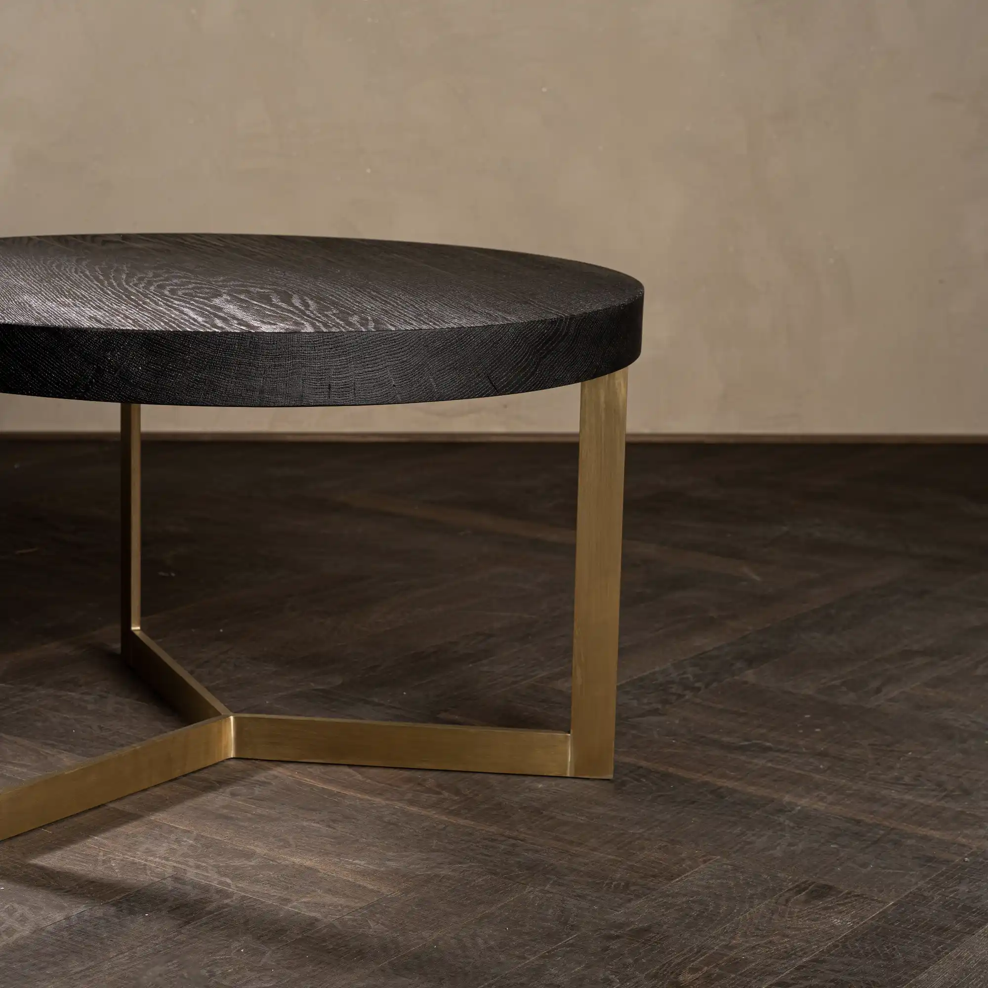 Eine dicke und runde Scheibe massiver Mooreiche mit extrem dunkler Färbung und feiner Maserung ruht auf einem mid-century-inspirierten Beingestell aus geschliffenem Messing.