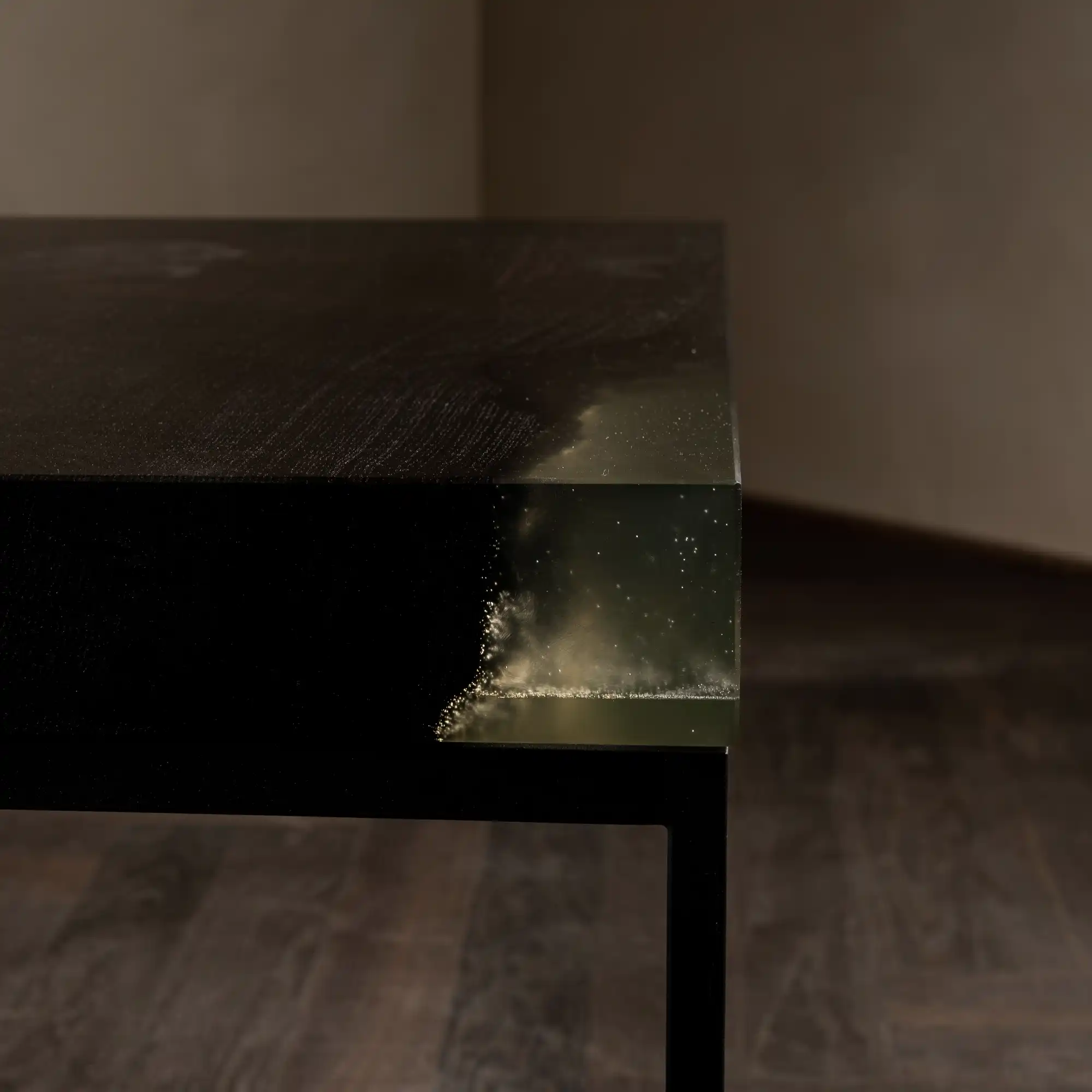 Dicker geht es kaum: Massive 67 mm Mooreiche mit lebhafter Baumkante werden mit transparentem Epoxidharz zu einem perfekten Quader ergänzt. Das Harz erlaubt den Durchblick zur Baumkante und sorgt für fast kristallische Akzente, die durch Luftbläschen erzeugt werden.