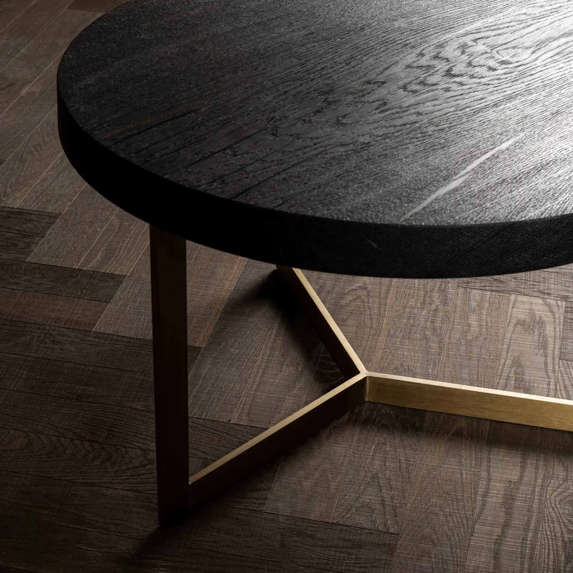Eine dicke und runde Scheibe massiver Mooreiche mit extrem dunkler Färbung und feiner Maserung ruht auf einem mid-century-inspirierten Beingestell aus geschliffenem Messing.