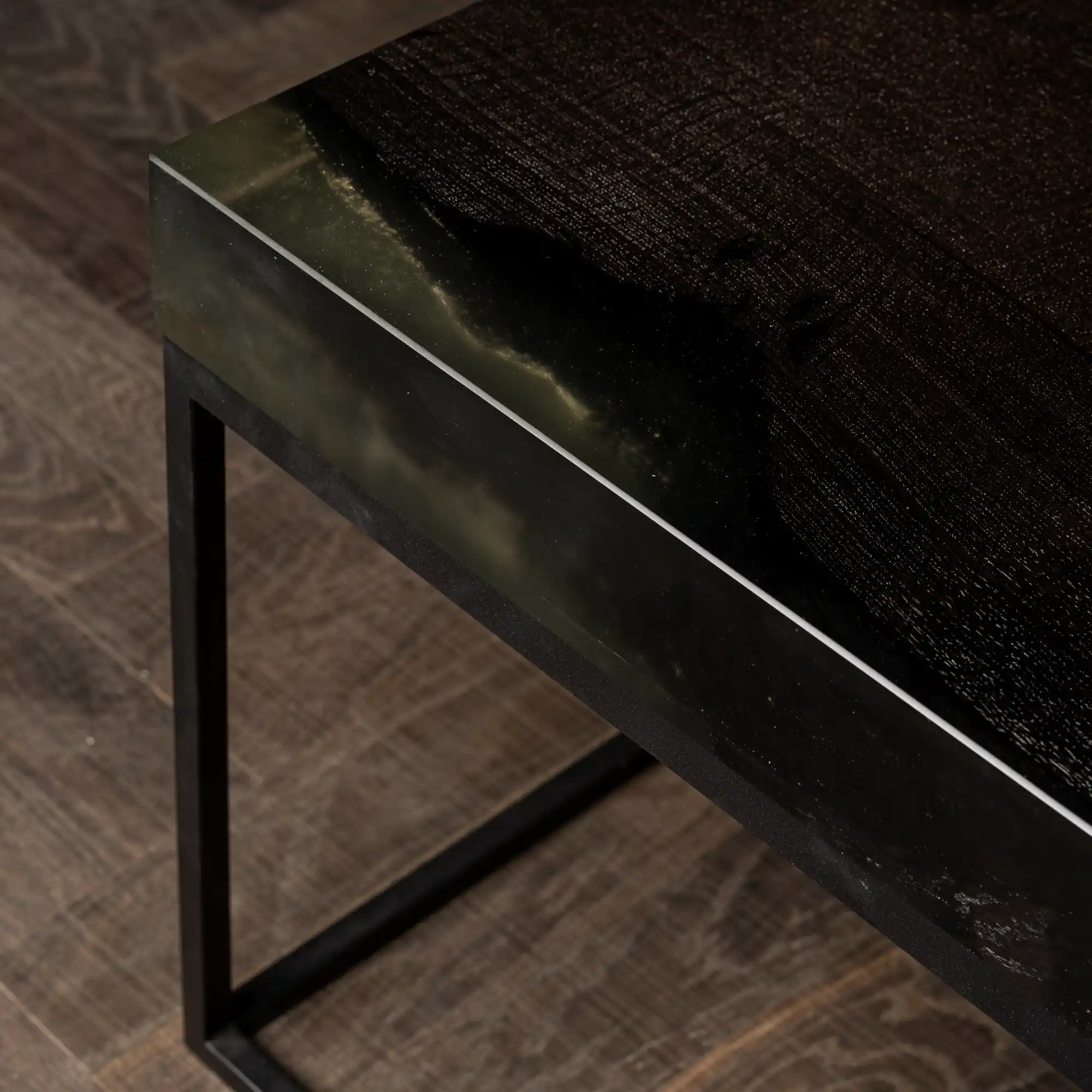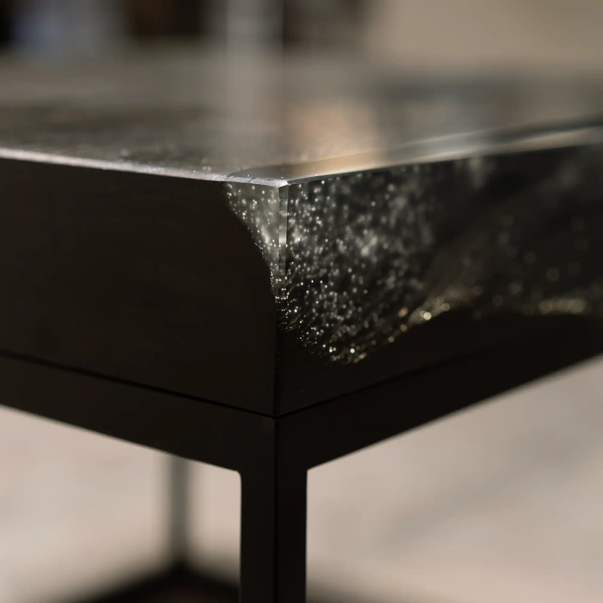 Dicker geht es kaum: Massive 67 mm Mooreiche mit lebhafter Baumkante werden mit transparentem Epoxidharz zu einem perfekten Quader ergänzt. Das Harz erlaubt den Durchblick zur Baumkante und sorgt für fast kristallische Akzente, die durch Luftbläschen erzeugt werden.
